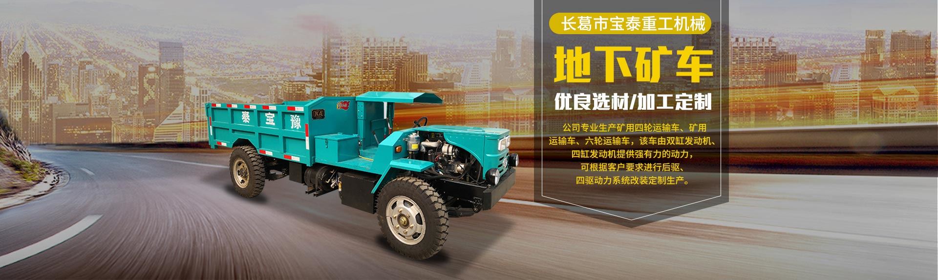 長(zhǎng)葛市寶泰重工機(jī)械有限公司坐落于全國(guó)百?gòu)?qiáng)縣(市)——長(zhǎng)葛市。南接魏都許昌,北依省會(huì)鄭州,距新鄭國(guó)際機(jī)場(chǎng)二十六公里,107國(guó)道與京珠高速?gòu)墓咀笥掖┻^(guò)。得天獨(dú)厚的交通環(huán)境為有識(shí)之士來(lái)公司指導(dǎo)合作提供了便利條件。 公司專(zhuān)注生產(chǎn)礦用四輪運(yùn)輸車(chē)、礦用運(yùn)輸車(chē)、六輪運(yùn)輸車(chē),該車(chē)由雙缸發(fā)動(dòng)機(jī)、四缸發(fā)動(dòng)機(jī)提供強(qiáng)有力的動(dòng)力,該產(chǎn)品適應(yīng)巷道、隧道、平原、山區(qū)、工地各種道路,通過(guò)能力強(qiáng),運(yùn)載馬力大,質(zhì)量可靠,可根據(jù)客戶(hù)要求進(jìn)行后驅(qū)、四驅(qū)動(dòng)力系統(tǒng)改裝定制生產(chǎn),深受各類(lèi)礦山實(shí)...